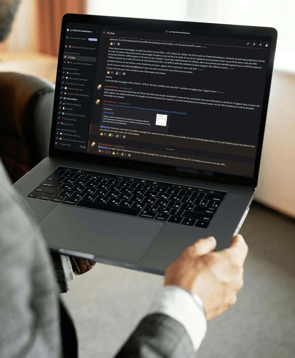 CLUB DES INVESTISSEURS - Le portefeuille synthétique de 15 à 20 lignes, les sessions de questions réponses chaque trimestre + accès au groupe discord du club avec 400 membres quasi permanents.