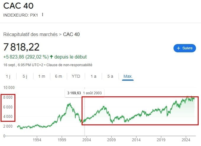 Sur la même période, le CAC 40 a fait environ 250% de gains (graphique ci-dessous) quand Loïc Abadie faisait 3,000%.